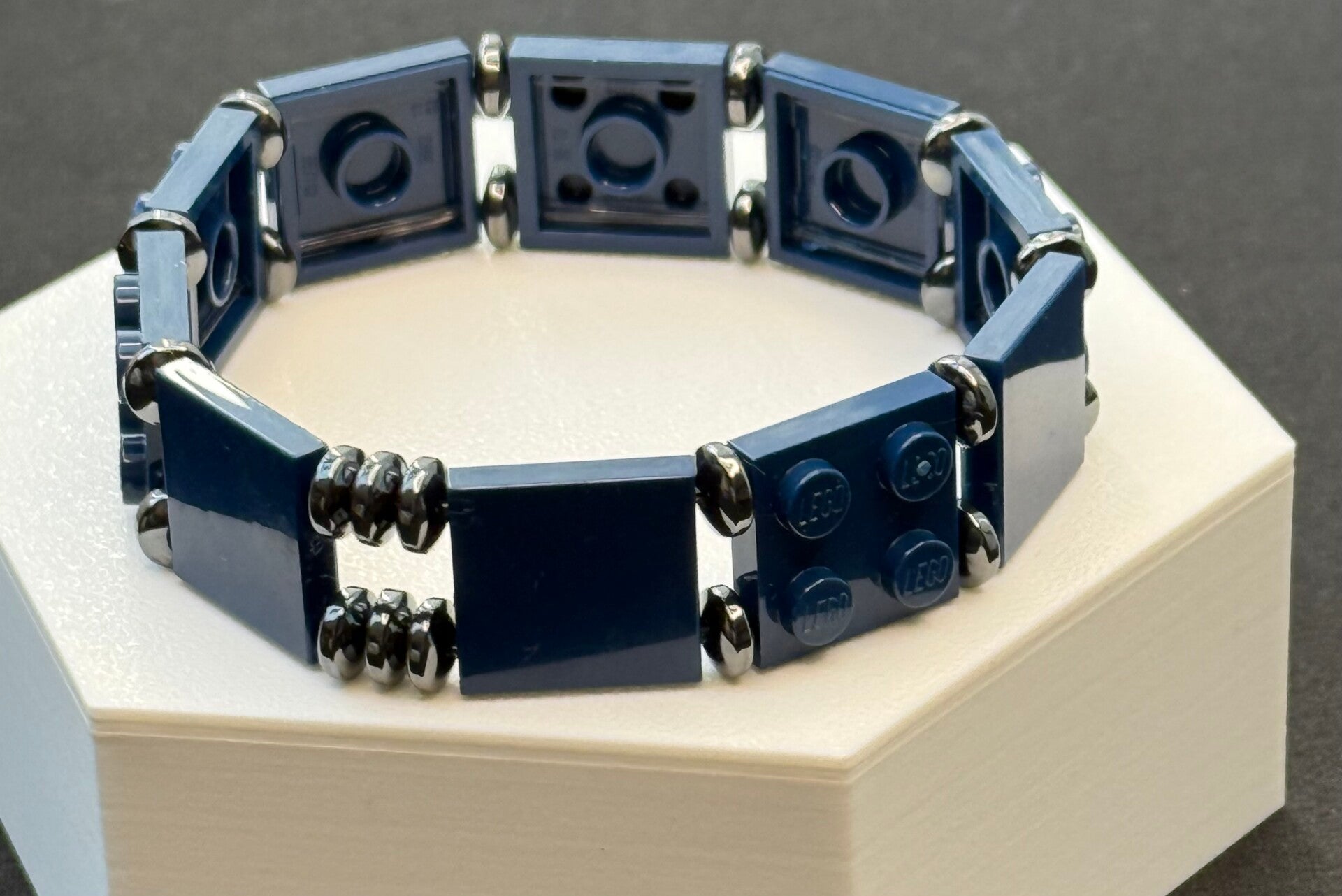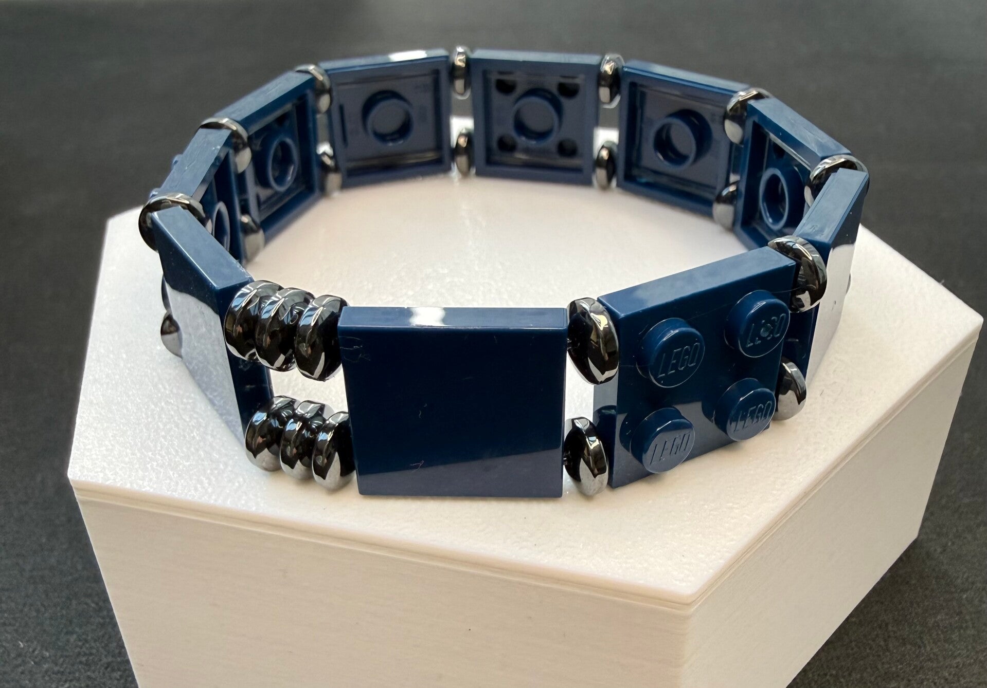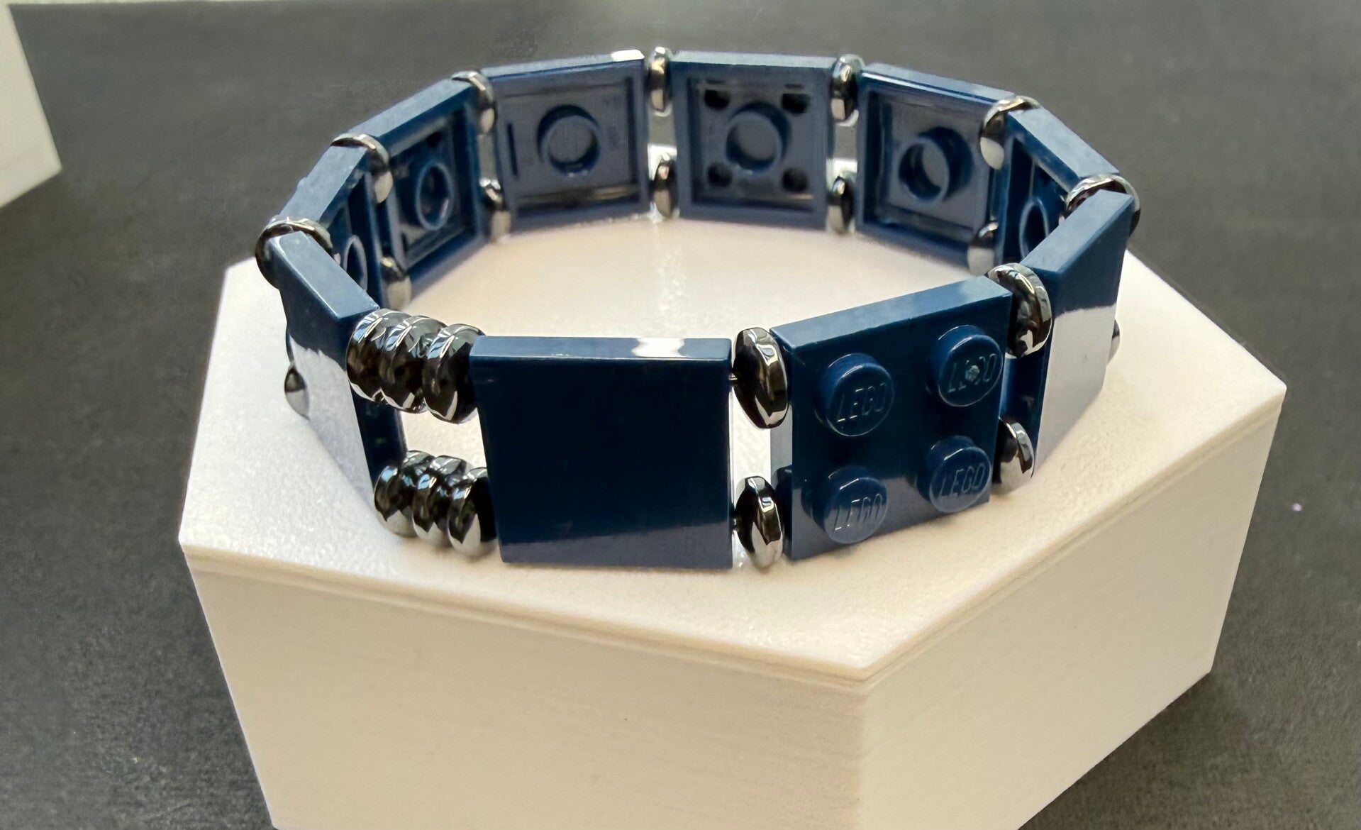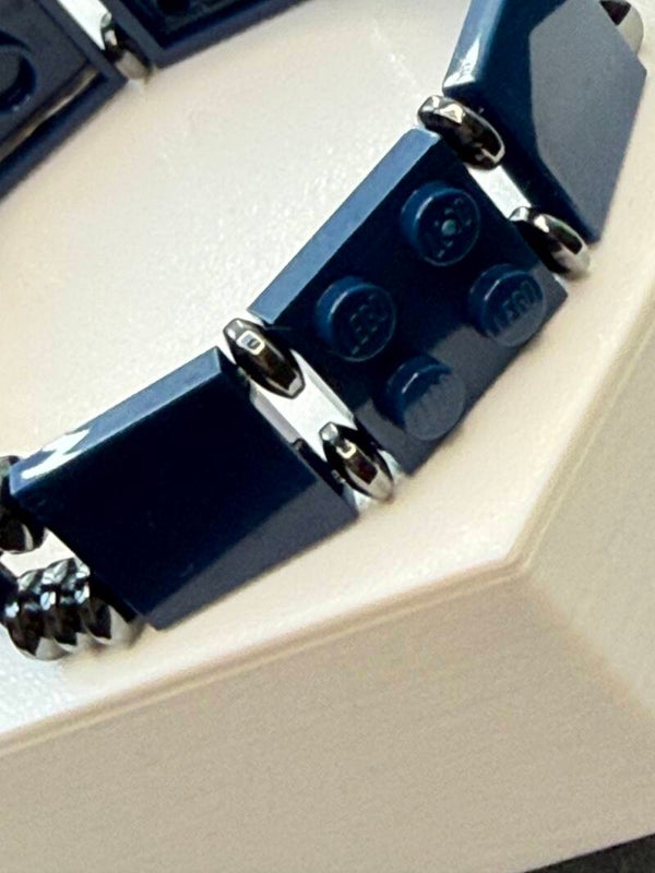 Bracelet homme bleu marine et acier inoxydable fabriqué à la main en France avec de vraies briques LEGO®. Sobre, solide et masculin — le cadeau parfait pour la fête des pères 🎁